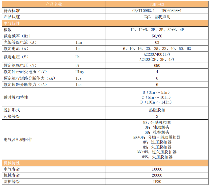 TGBT-63 小型透明外壳断路器 ( 以下简称断路器 ) 主要适用于交流50/60Hz,额定电压230V/400V,额定电流至63A的工业、商业/民用建筑、基础建设的临时用电等场所的电力线路设施和电气设备进行过载和短路保护之用,亦可用于不频繁地通断操作。